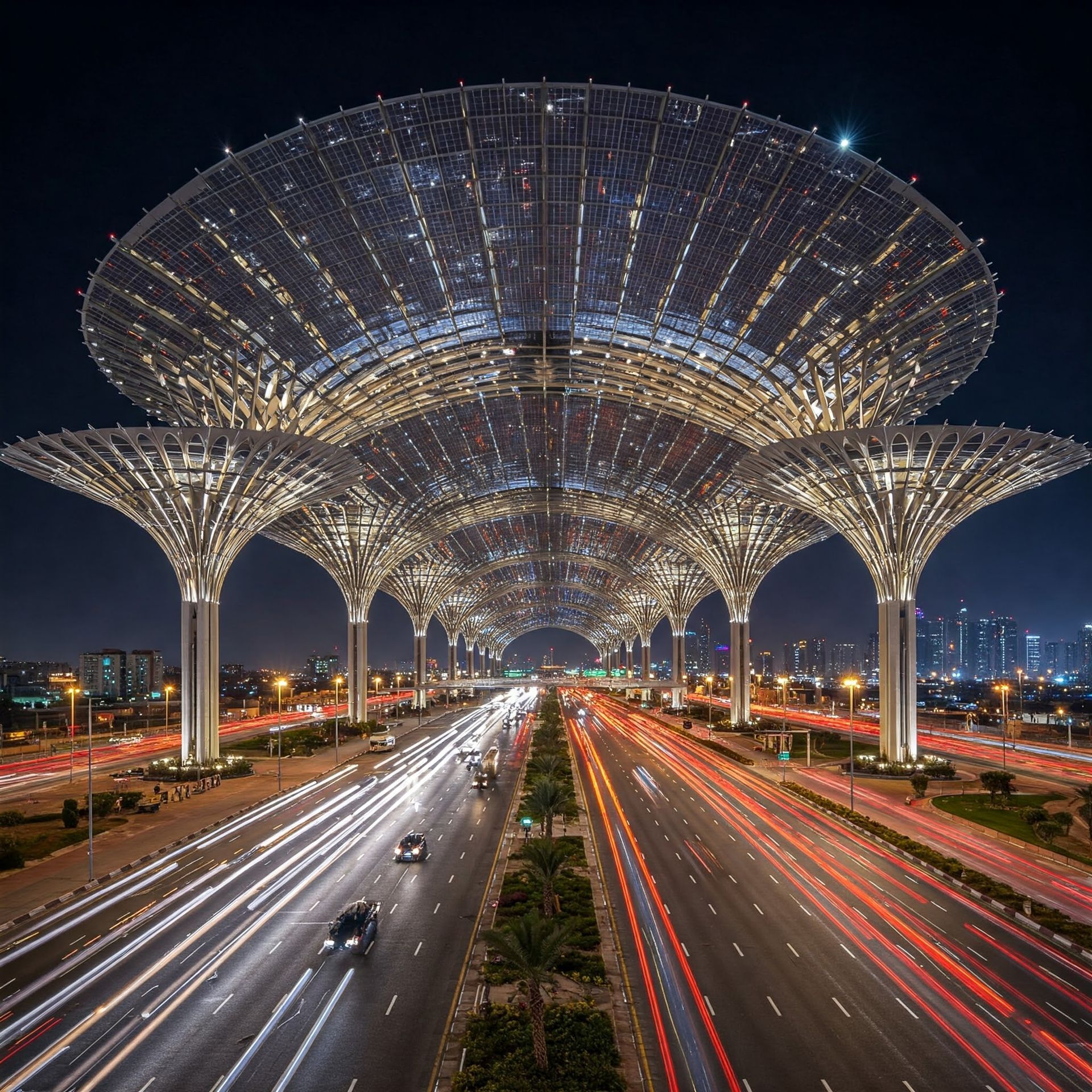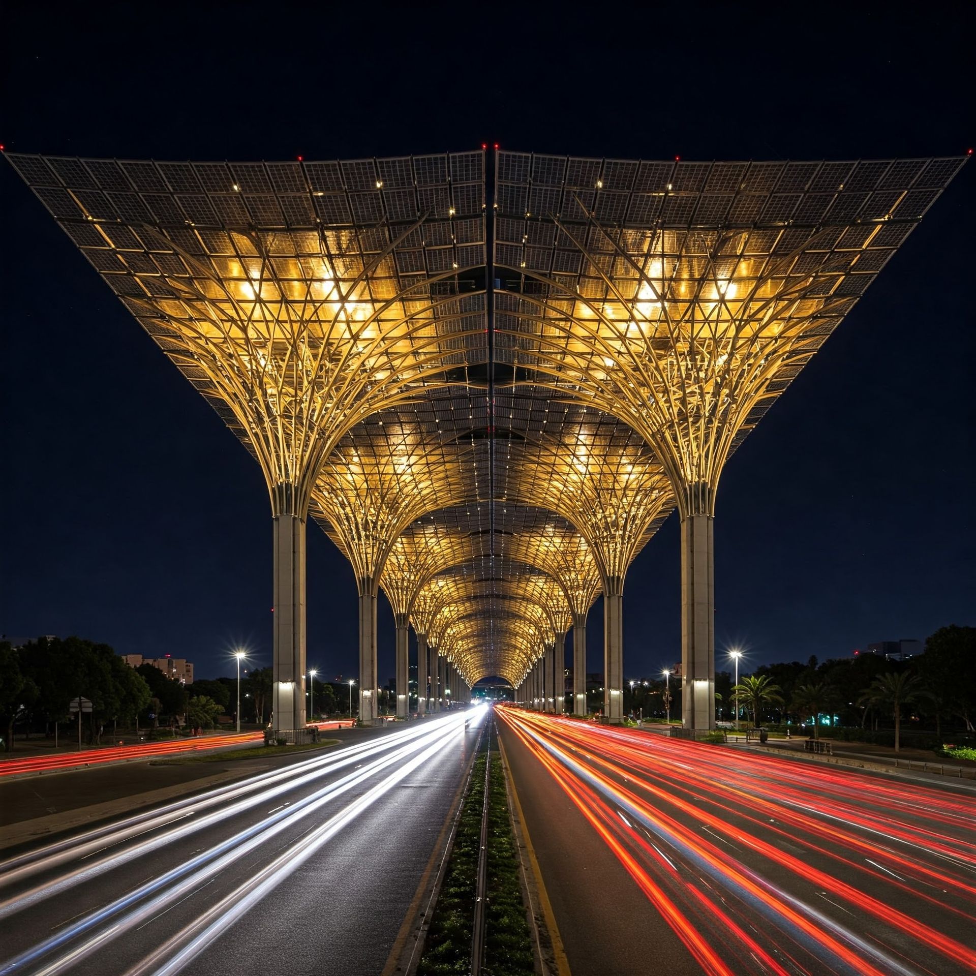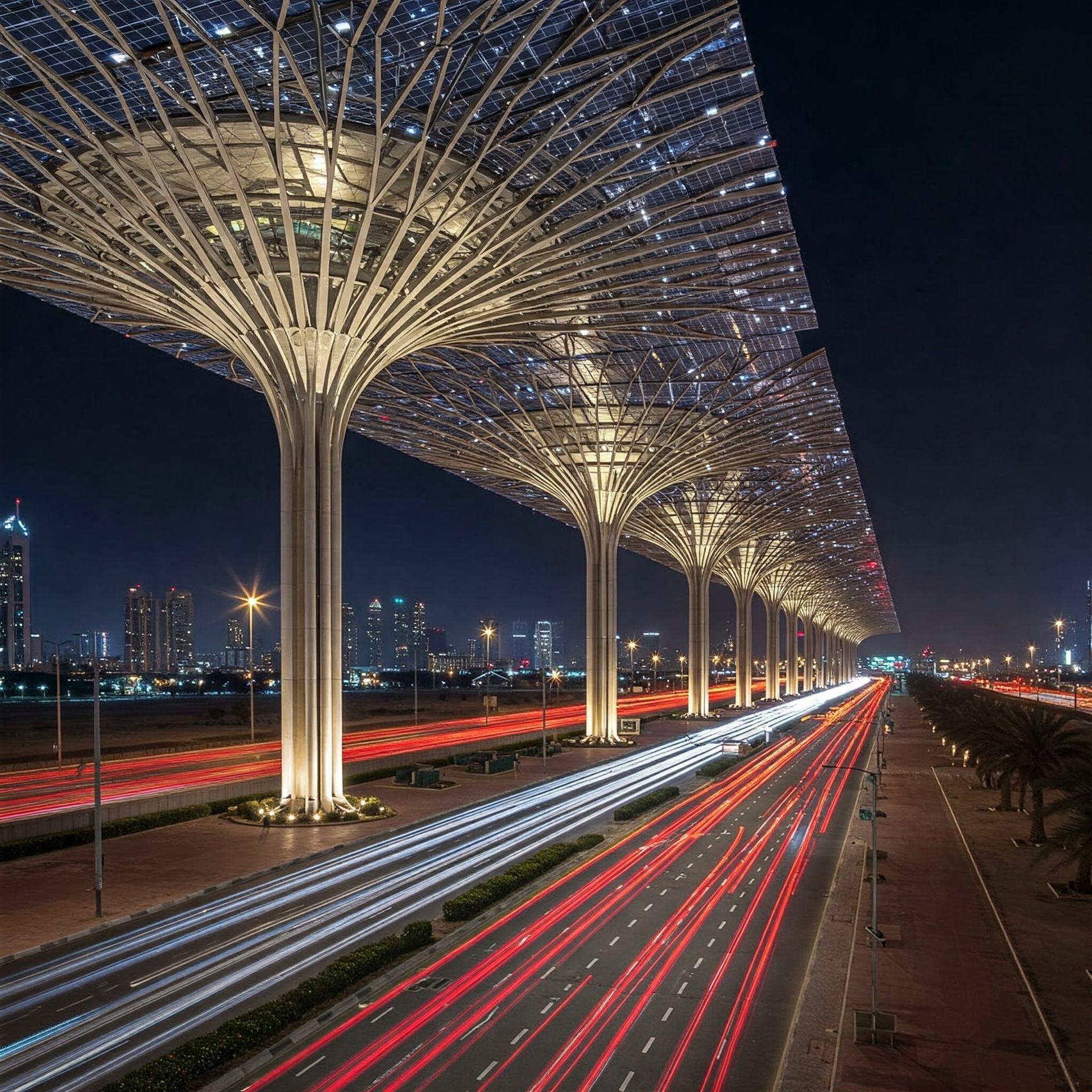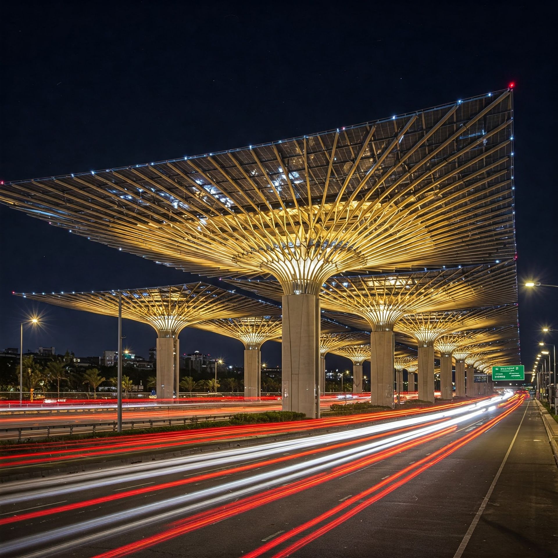 We design elegant, functional bridges over highways and tollways—architectural forms that host integrated solar panels while connecting communities. These solar bridges generate clean energy, reduce land use pressure, and merge light, structure, and sustainability into one. It's not just lighting. It’s infrastructure that powers cities with these backgrounds: